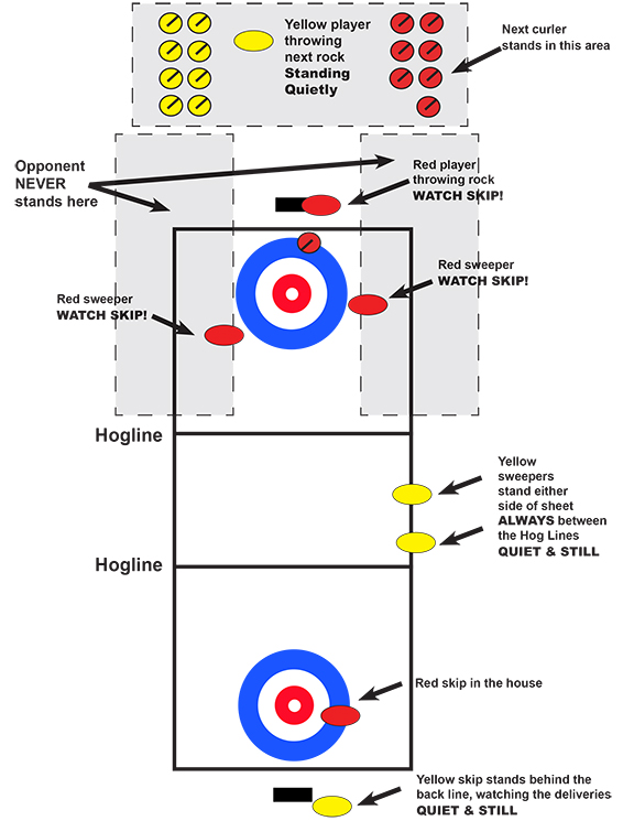 Do not disturb a curler in the hack. If you are waiting to play, stand quietly well behind the curler and out of reach of the broom. If you are an opposing sweeper, stand still at the side of the sheet beyond the hog line.